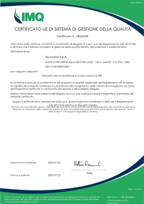 Das Qualitätssystem von Tecnoline Spa ist nach ISO 13485:2016 zertifiziert. Tecnoline stellt CE0051-gekennzeichnete Medizinprodukte und Medizinprodukte für Dritte her. Die Arbeitsumgebung ist kontrolliert und nach ISO 8 zertifiziert.